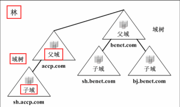 域林是指若干个域树通过建立信任关系组成的集合,林中每个域树都有唯一的名称空间,它们之间不连续。可以通过域树之间建立信任关系来管理和使用整个域林中的资源,保持原有域内自身的特效。在林中,只要拥有其中一个域内的权限,就可以防蚊林中其他的资源。
