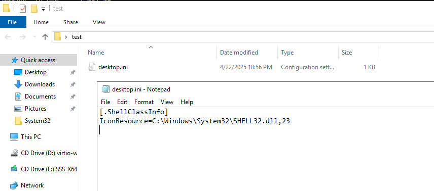 新建test文件夹,修改该文件夹图标为任意一个,查看desktop.ini并修改文件