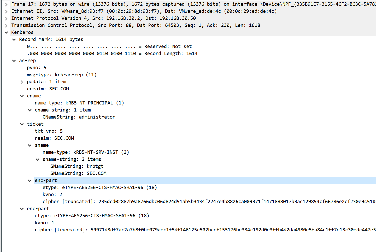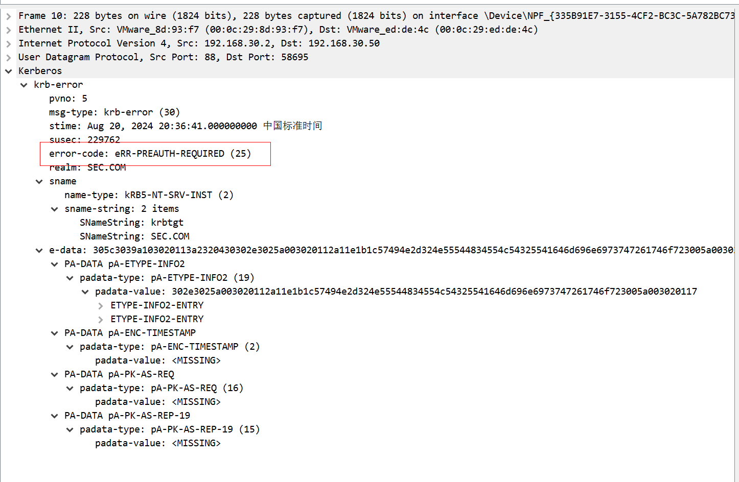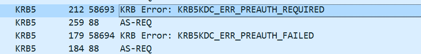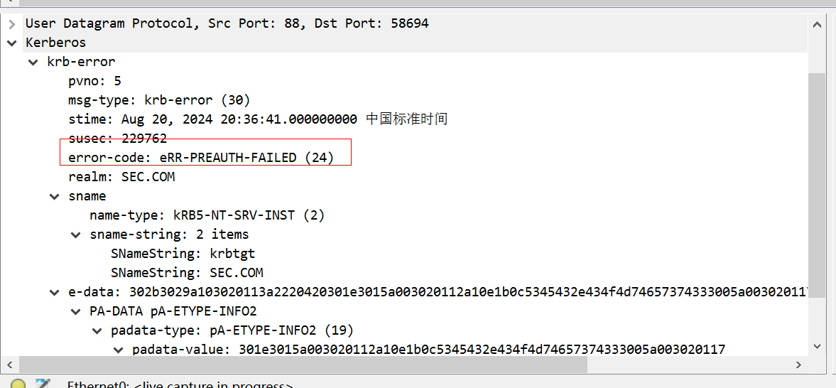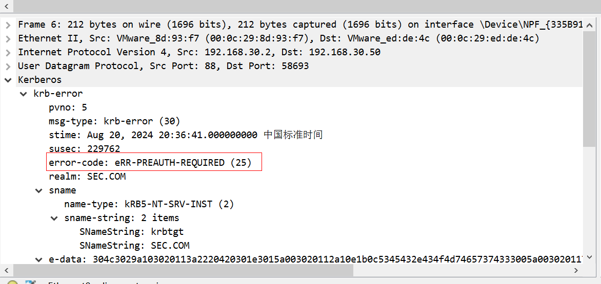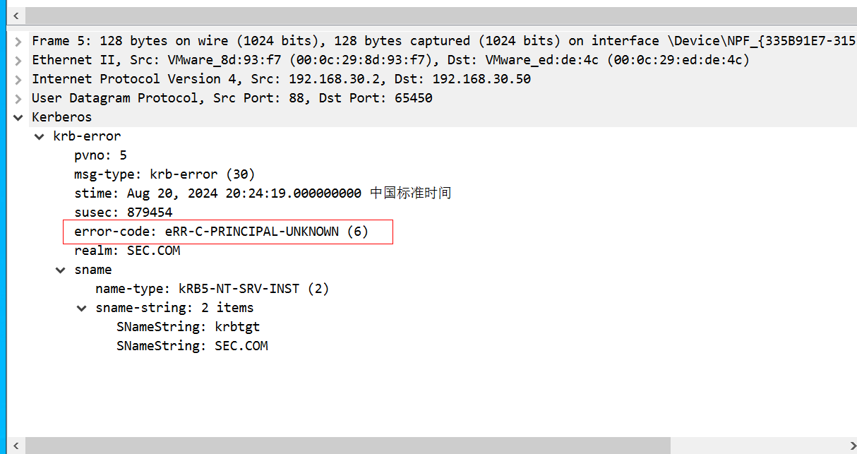 接着先看第一个响应包,返回报文KRB5DC_ERR_C_PRINCIPAL_UNKNOWN代码,代表了error1用户不存在