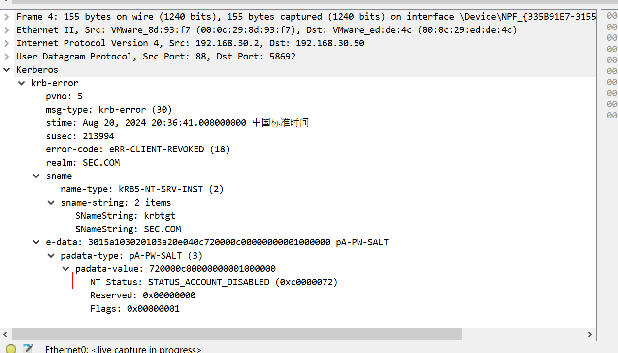 继续看第二个响应包,返回报文KRB5KDC_ERR_CLIENT_REVOKED NT Status: STATUS_ACCOUNT_DISABLED代码,代表hack用户存在但被禁用