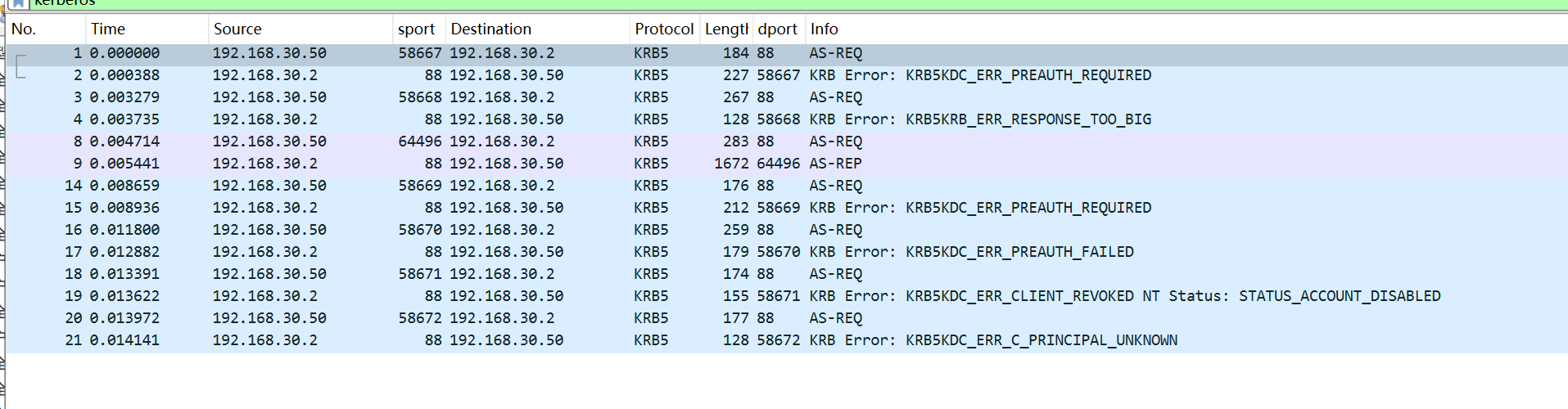 尝试使用kerbrute工具对administrator(正常且密码正确),test3(正常但密码错误),hack(禁用),error1(不存在)四个账号进行测试,并且使用wireshark抓包。