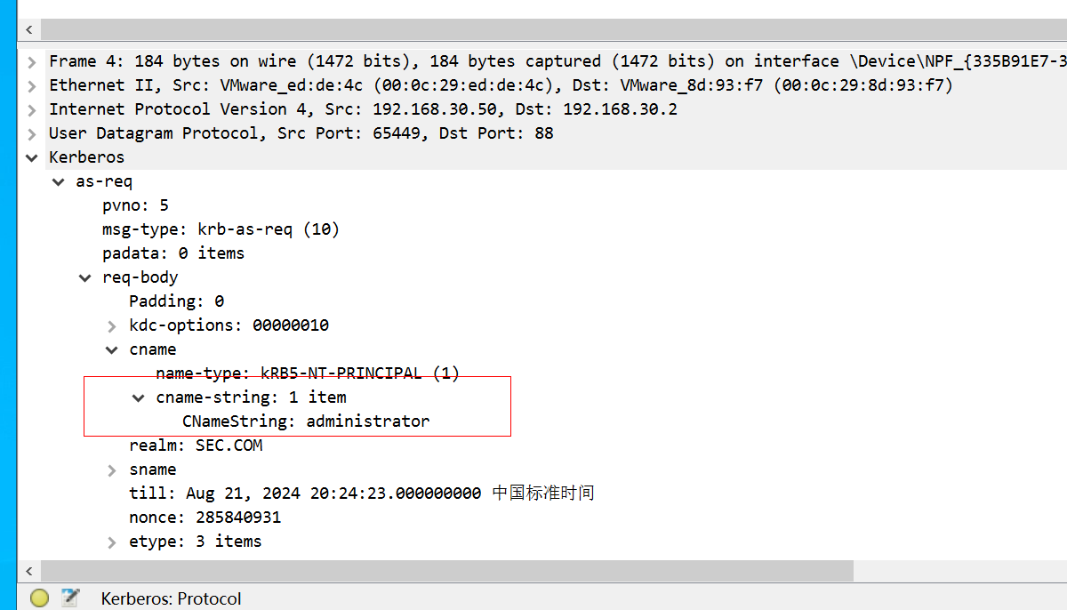 先来看前四个AS-REQ的报文,报文里CNameString包含了用户名