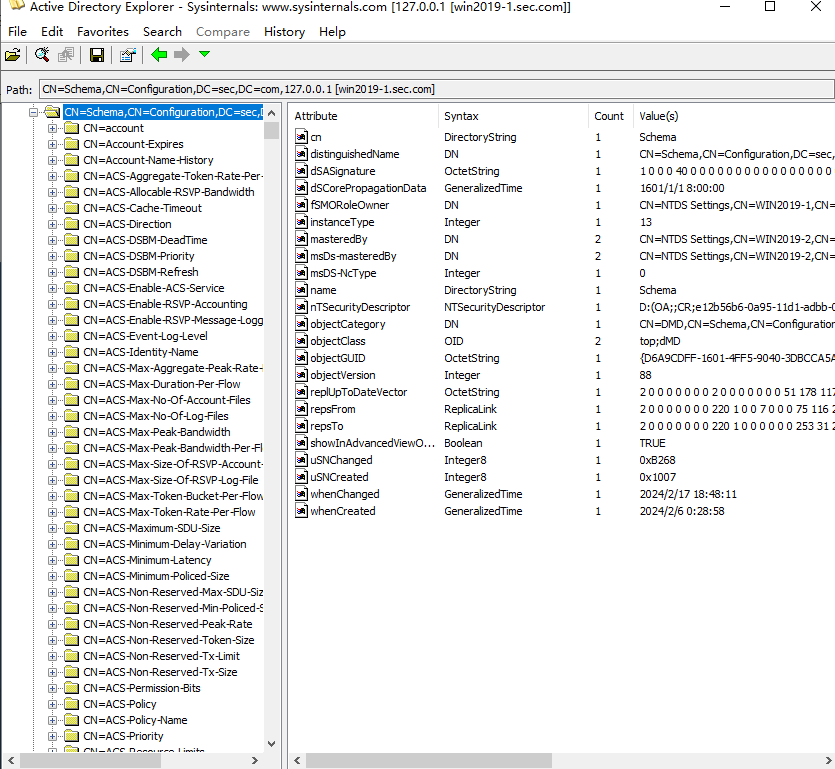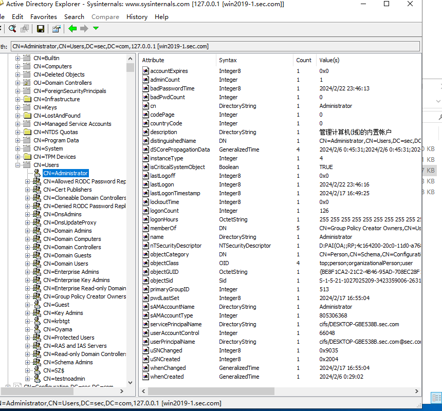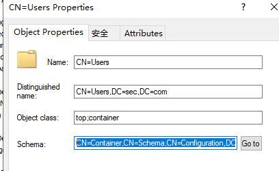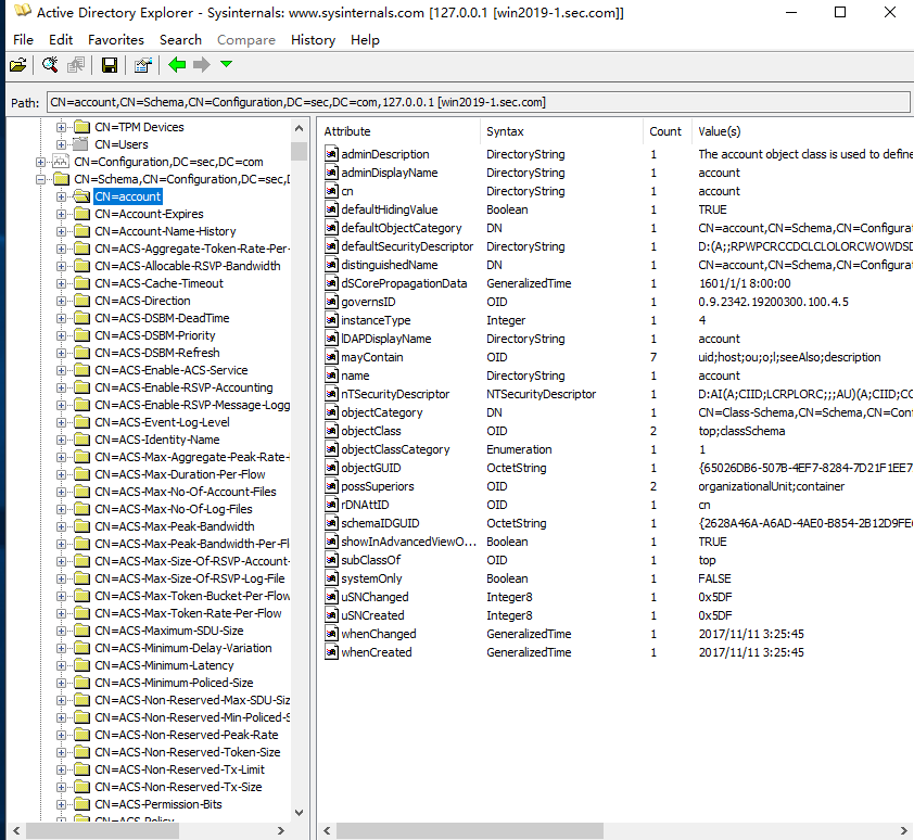 比如"CN=account,CN=Schema,CN=Configuration,DC=sec,DC=com",字段如下面。对比CN=administrator拥有的属性,可以发现确实继承了CN=account的属性