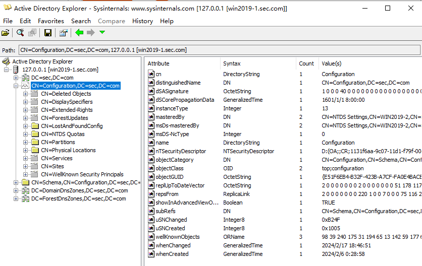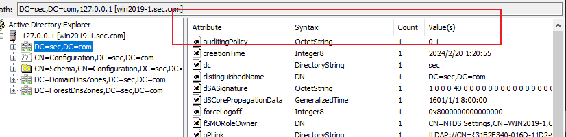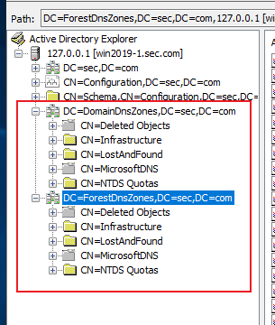 每个域各有一个域目录分区,关联本地域相关的用户和计算机,如"DC=sec,DC=com",以下都是本地域的目录分区