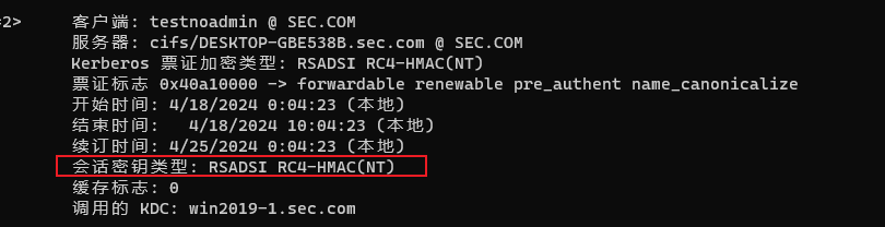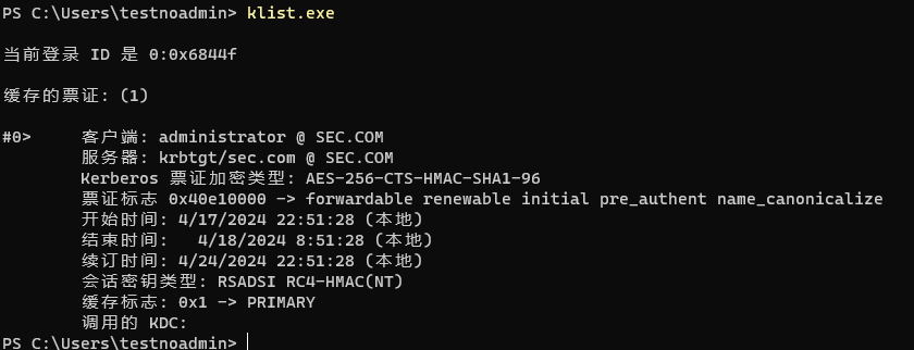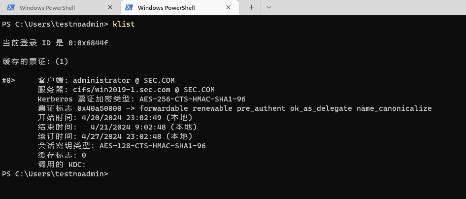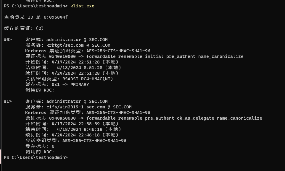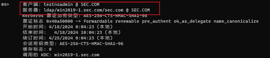 就比如下图klist,虽然以testnoadmin申请到了ldap/win2019-1.sec.com/sec.com的ST票据,但是客户端实际没有权限访问win2019-1的ldap服务,所以申请了票据但是用不出去。