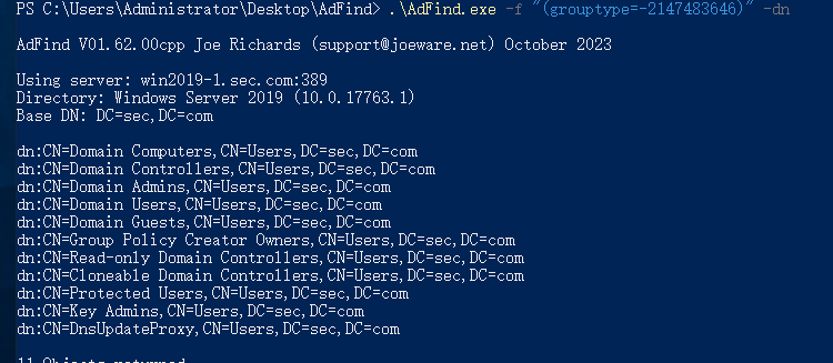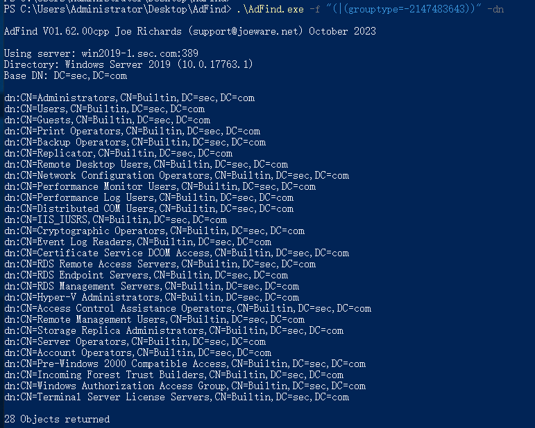 PS C:\Users\Administrator\Desktop\AdFind> .\AdFind.exe -f "(objectcategory=group)" -dn