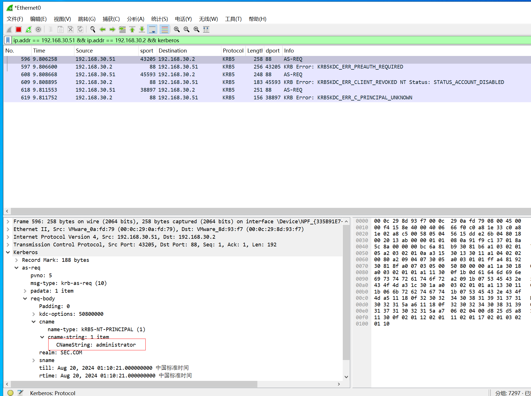 使用msf模块kerberos_enumusers,且字典放入三个用户名,administrator存在且有效,hack存在但禁用,error1不存在,启动wireshark抓包。